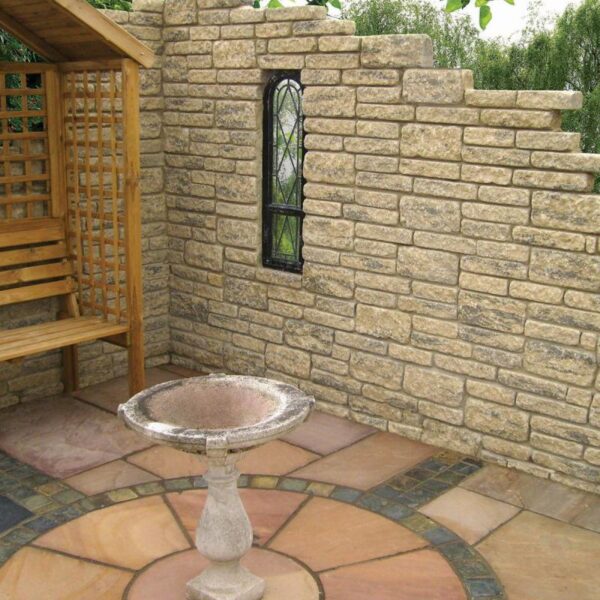 Natural Light Weathered Tumbled Burford Walling – This light yellow reconstituted stone walling with grey highlights has a tumbled surface. Tumbled walling has been manufactured to produce a rough but more antique, aged finish to the stone.
