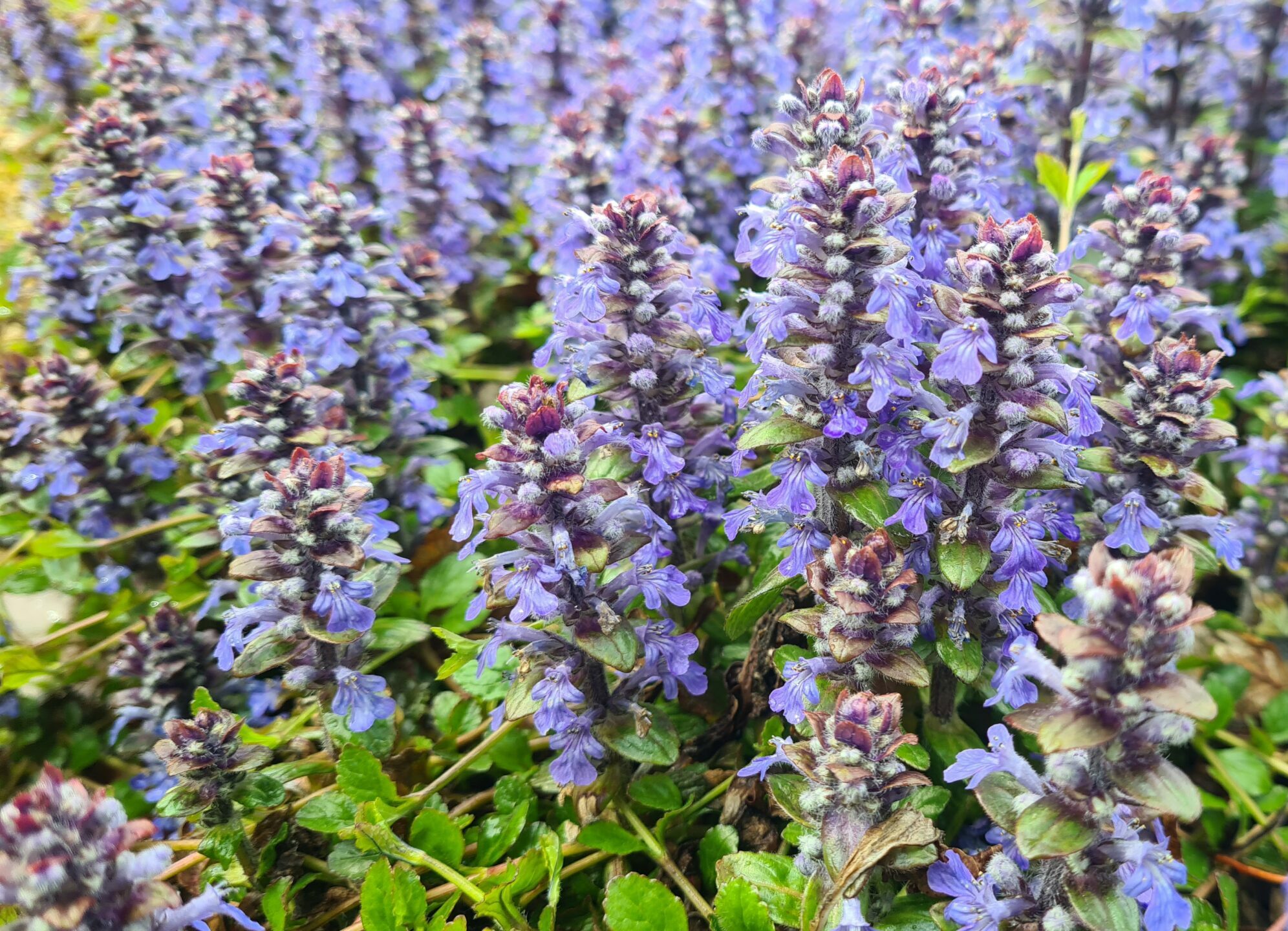 Ajuga reptans, also known as Bugle, is a native evergreen ground cover spreading plant that produces spikes of bright blue flowers in the spring, which are