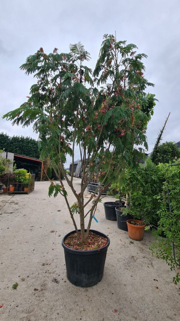 If you’re looking for a tree that feels instantly exotic and uplifting, Albizia julibrissin (the Silk Tree) is a real showstopper. With a multi-stem form, i