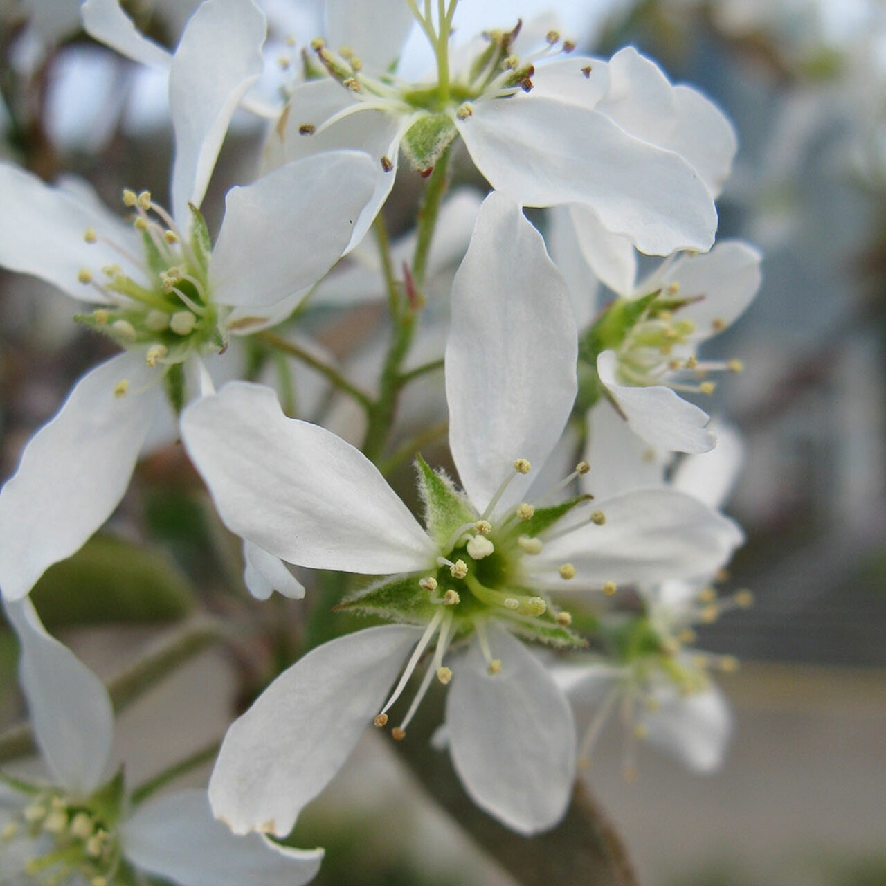 Amelanchier canadesis is a dense, upright shrub producing sprays of small, white, star-shaped flowers in late spring, followed by blue-black berries which a