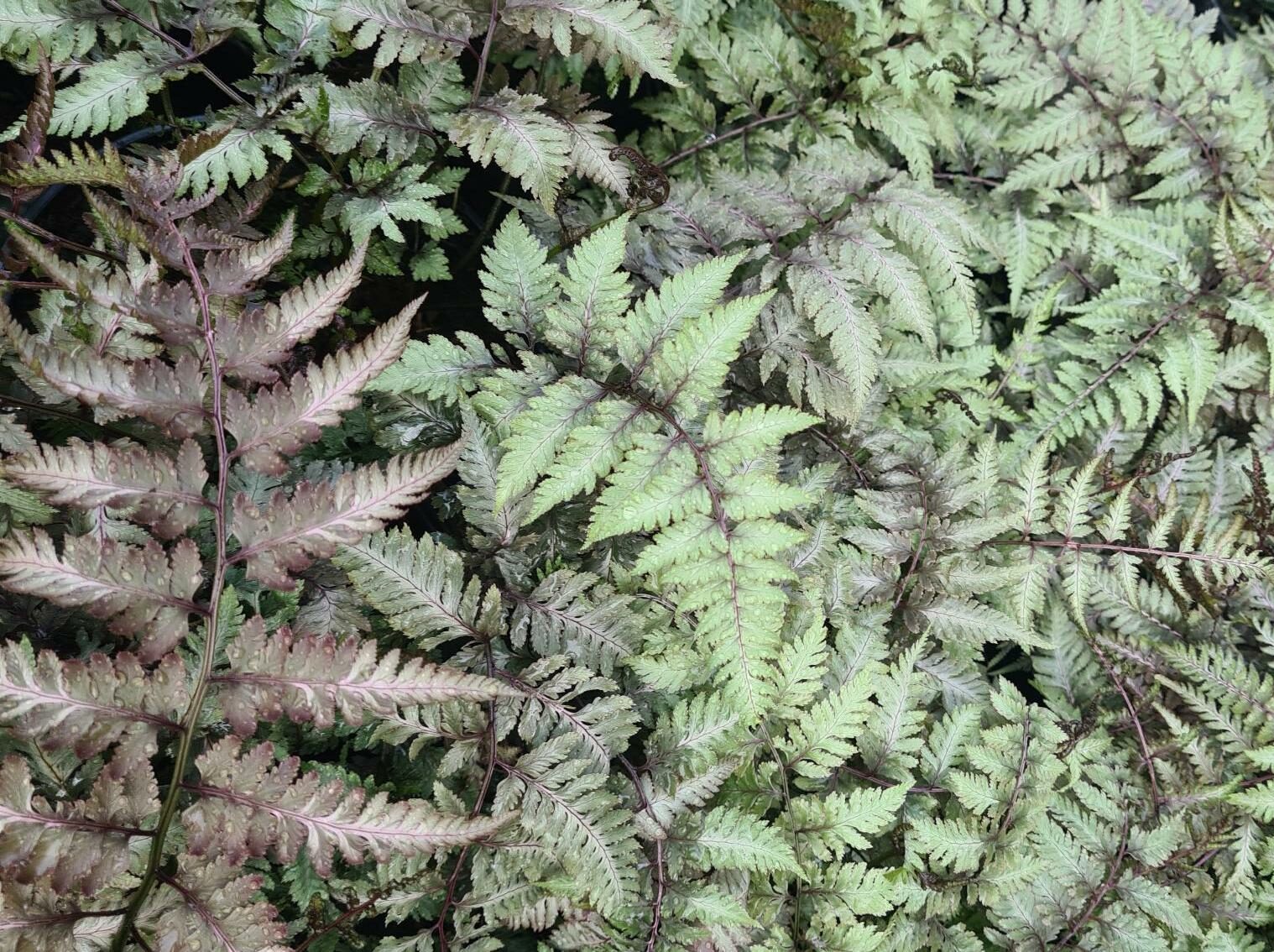 Athyrium niponicum Metallicum is a variety of Japanese painted fern with striking silver fronds, which have beautiful purplish tones on the midrib and on th