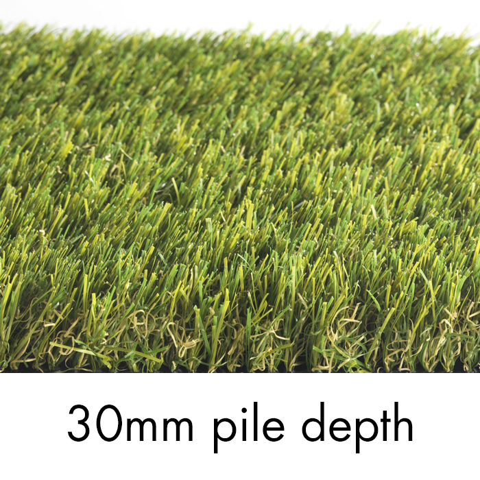 A high quality 30mm pile depth artificial grass with a fabulous visual appearance of real lawn. Suitable for landscaping, gardens, and terraces with heavier footfall.