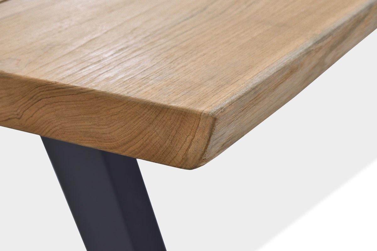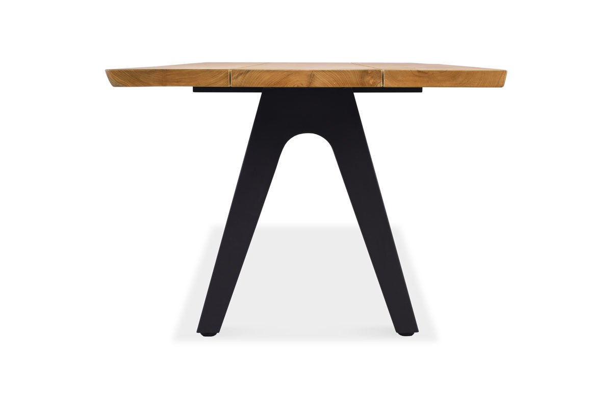 Fixed dining table from teak top and aluminium base for outdoor use. Special feature of this table design lies in the corrugated edges, to make it unique an