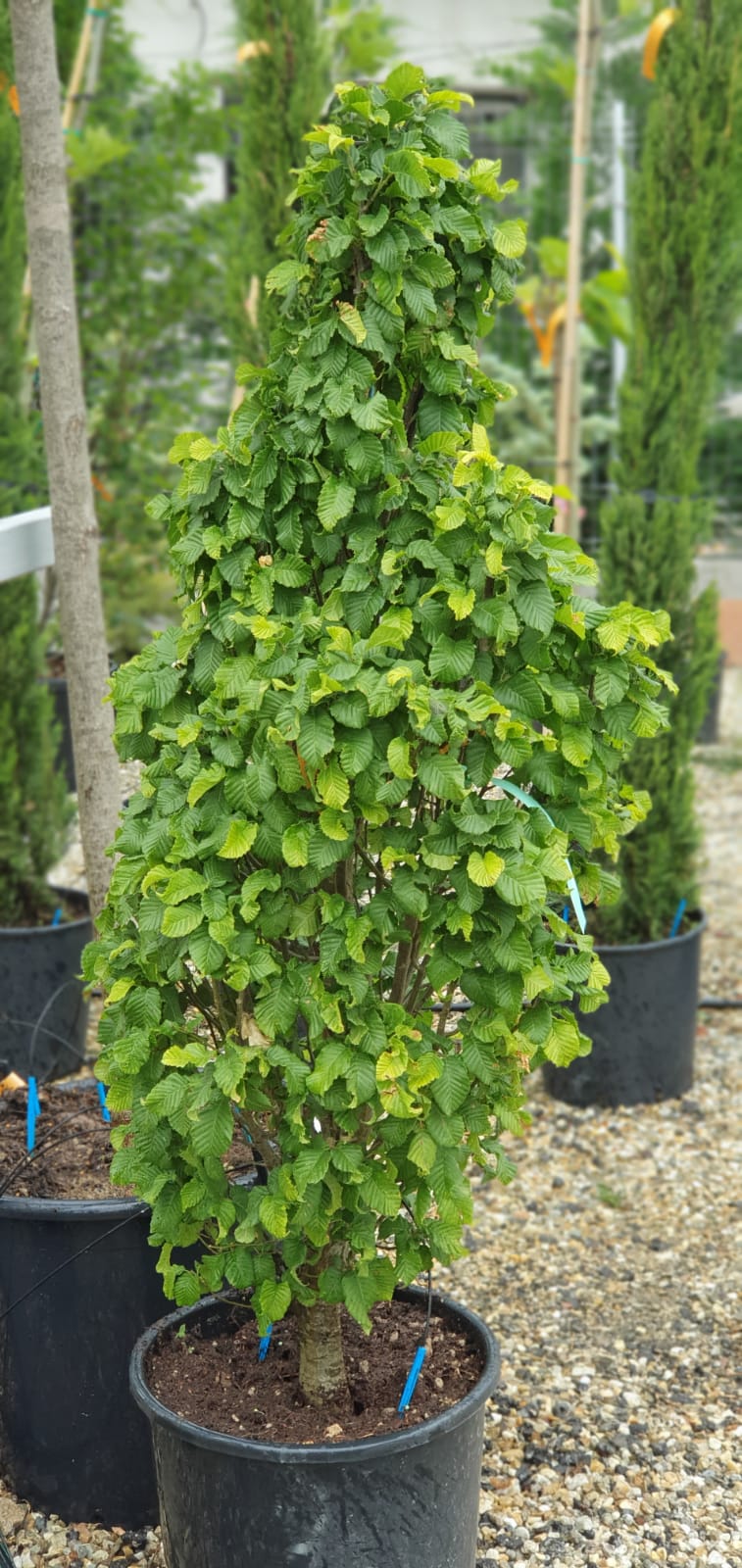 Carpinus betulus Monumentalis or Dwarf Hornbeam has a delightful shape – conical, almost candle flame-like in silhouette. This sturdy Carpinus is a slowe