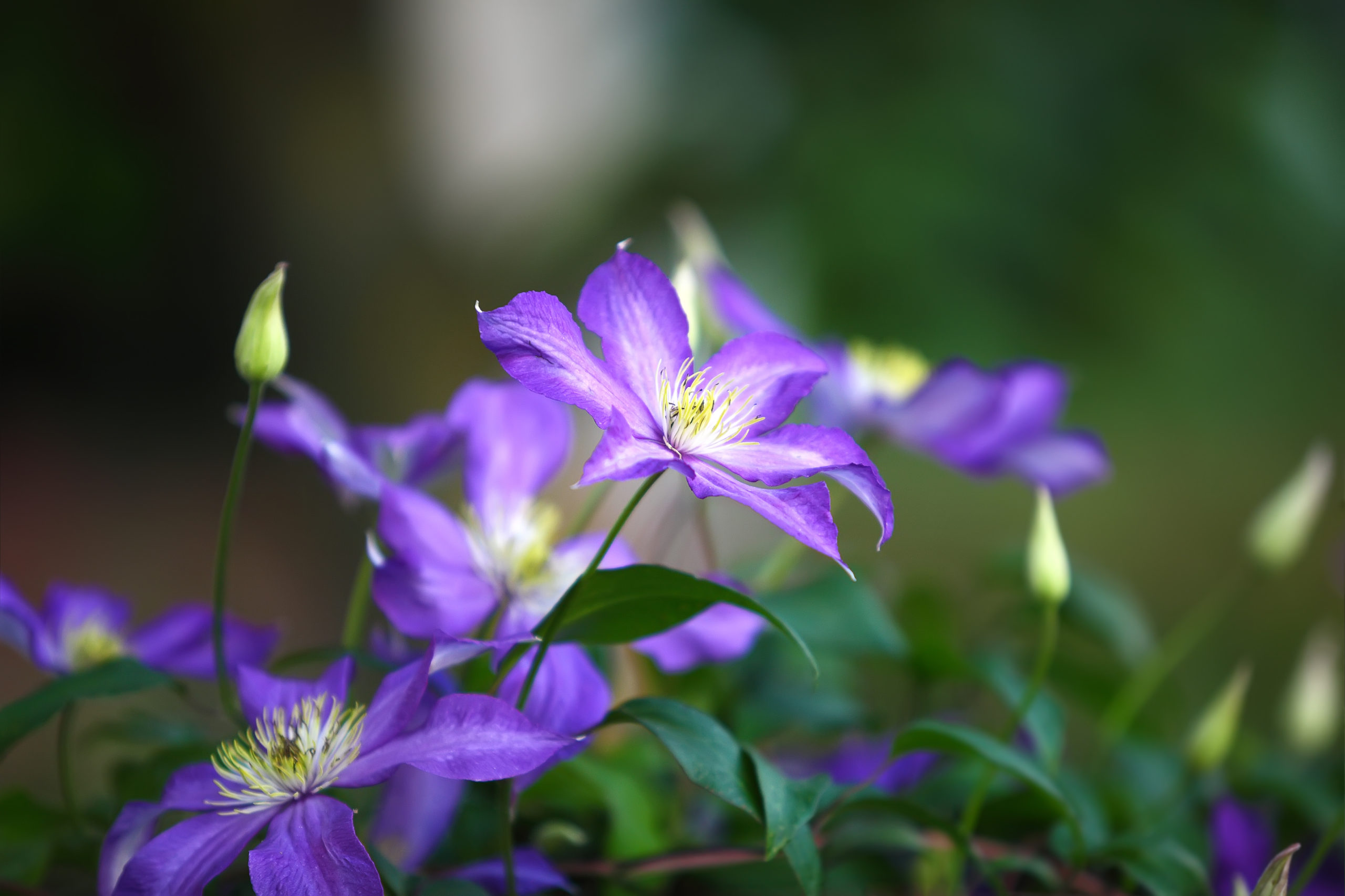 Clematis ‘Jackmanii’ is a vigorous climber that will produce an abundance of large, striking, dark purple flowers from July to September. It’s deciduous so