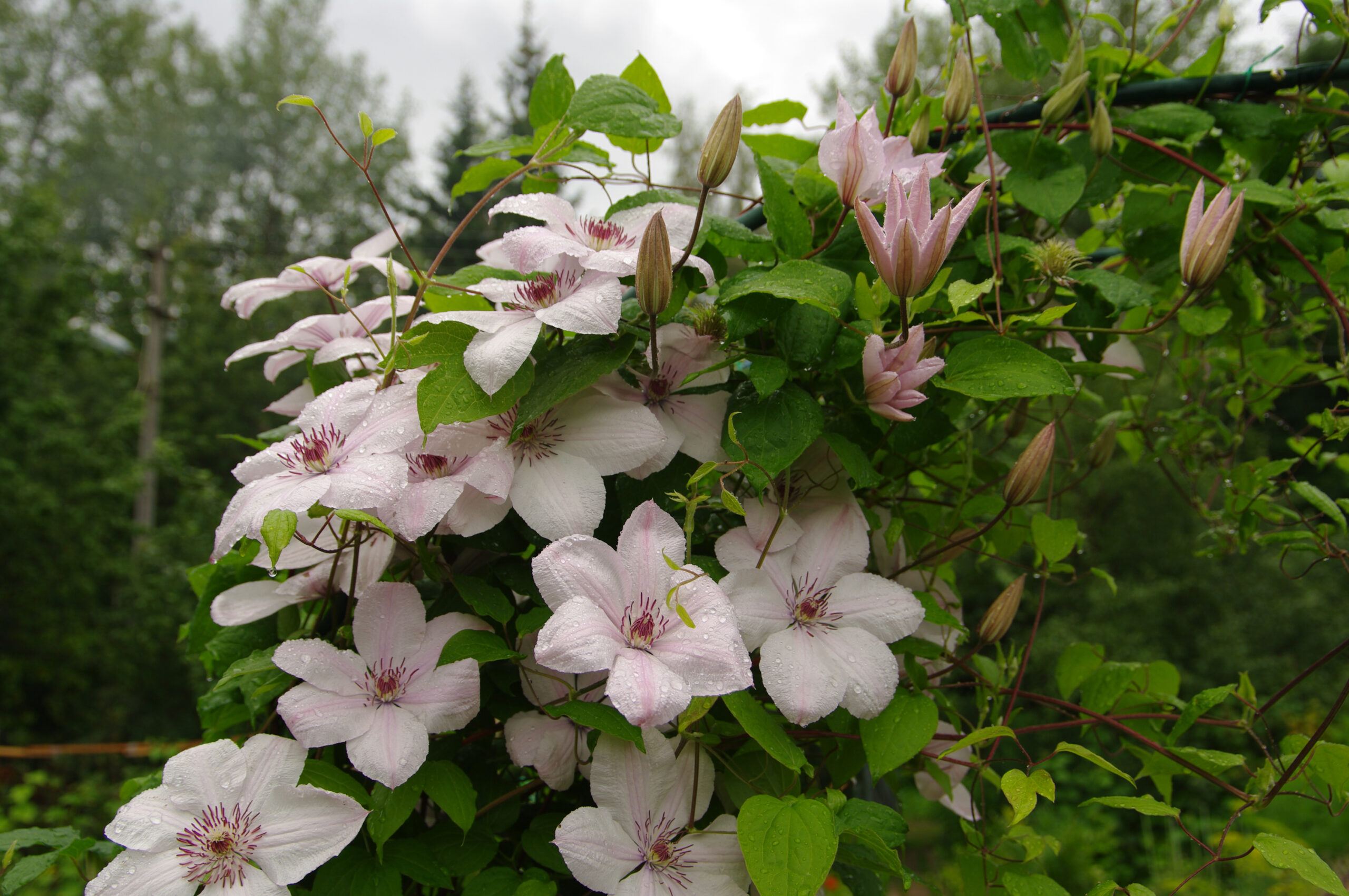 Clematis 'Jan Pawel II' is a vigorous, deciduous climber admired for its large, creamy-white flowers tinged with pale pink, which deepen into a more pronoun