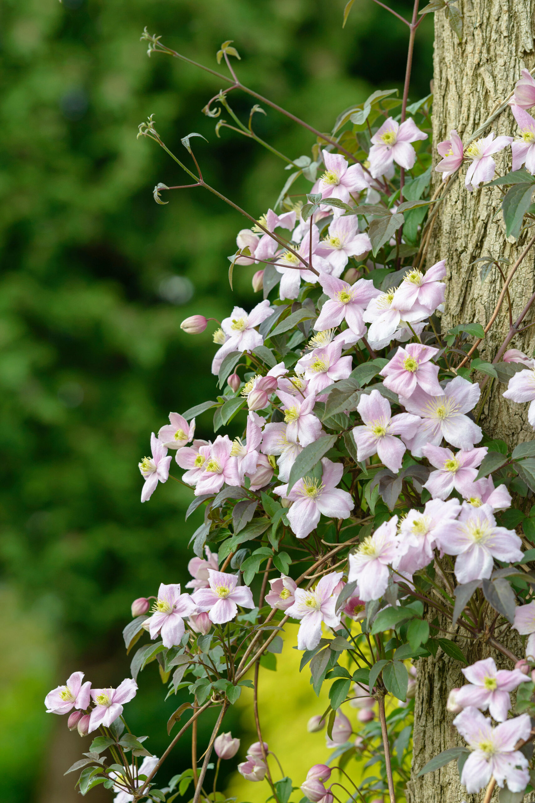 Clematis 'Mayleen' is a vigorous, deciduous climber with a profusion of light pink flowers with rounded, overlapping petals that bloom in late spring to ear