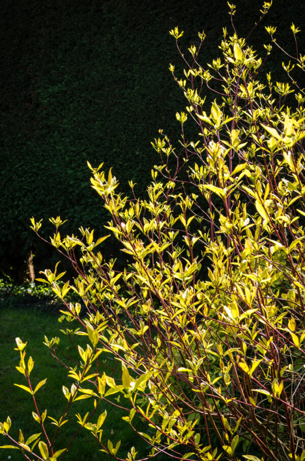Bright, cheerful and full of contrast, Cornus alba ‘Aurea’ is a wonderful shrub for bringing light into the garden. Its glowing golden-yellow foliage create