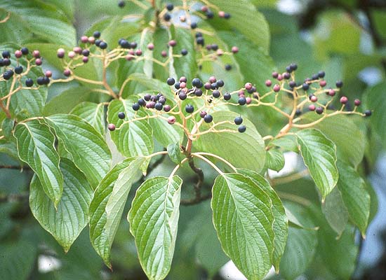 Throughout spring and summer, this captivating tree displays its characteristic bright green ovate leaves measuring 8-15cm long with distinctive parallel veins that create elegant texture. The leaves are arranged alternately along the branches—unusual for dogwoods which typically have opposite leaves, hence the name 'controversa' meaning controversial or disputed. But the tree's crowning glory is its extraordinary branching structure—the branches grow in distinct horizontal tiers, one above the other, creating a stunning layered effect that resembles a multi-tiered wedding cake or pagoda. This architectural form is present year-round but is most dramatic in winter when the structure is fully visible. In late spring to early summer, the tree becomes adorned with masses of tiny creamy-white flowers held in large, flat-topped clusters (corymbs) measuring 10-15cm across that sit elegantly on top of the horizontal branches, creating spectacular floral displays. In autumn, the foliage transforms into beautiful shades of red-purple and burgundy, and small blue-black berries develop providing food for birds. The smooth grey bark adds subtle winter interest.