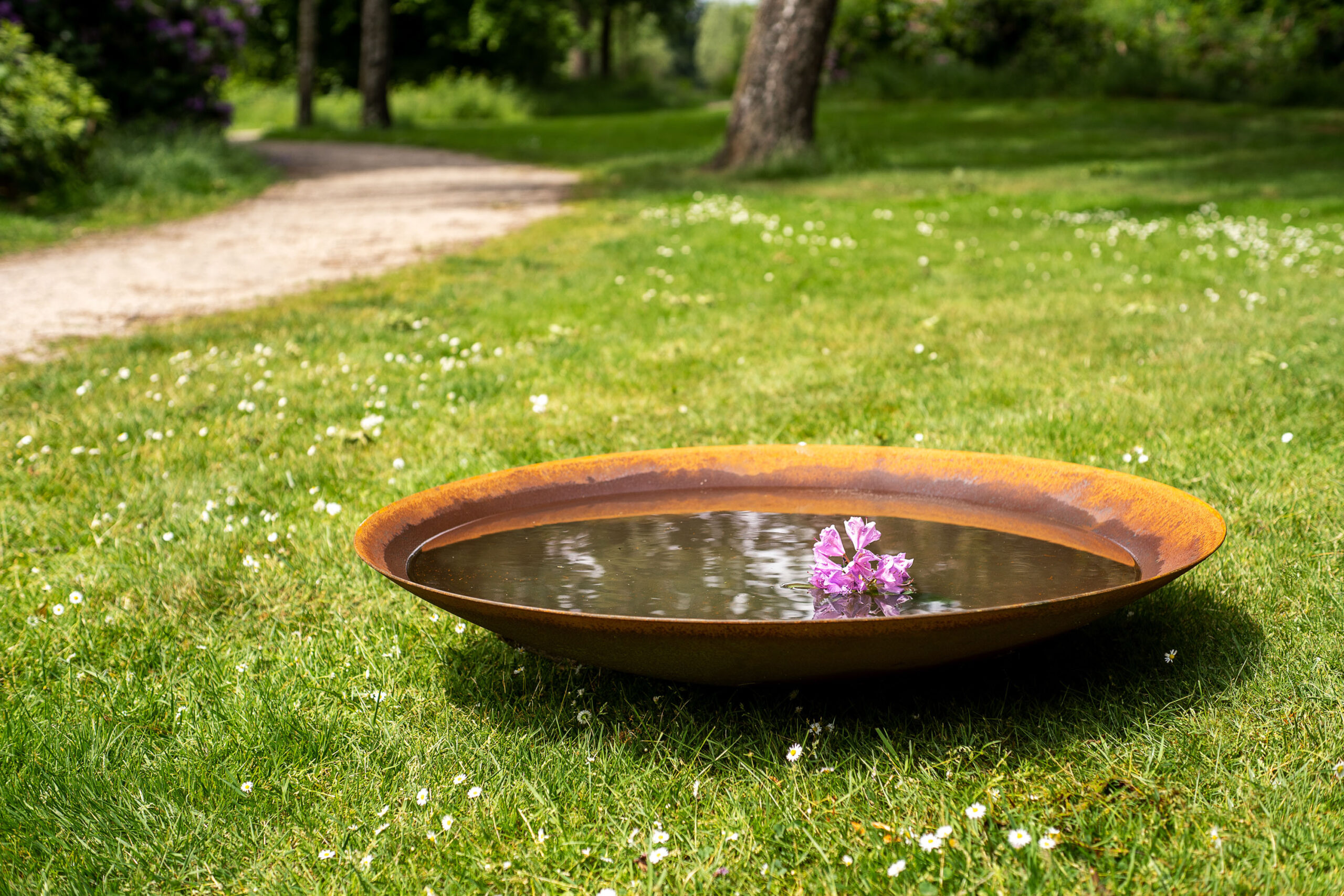 During the weathering process, some runoff may occur, which can temporarily stain nearby stone or paving. Placing the bowl on gravel or in planted areas can help minimise this.
