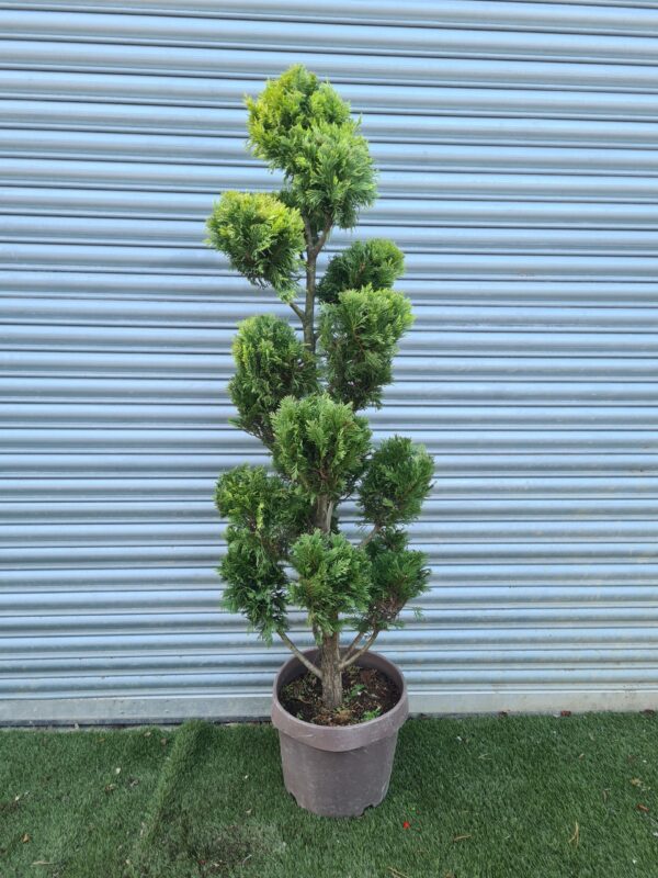 A little piece of evergreen architecture, glowing in gold. Cupressus ‘Gold Rider’ Pom Poms brings instant structure to a garden — clipped into soft, cloud-like tiers that look beautifully “finished” from the moment it arrives. Pop one either side of a doorway, nestle it into a mixed border for contrast, or use it as a statement in a generous pot on the patio. However you style it, it adds that calm, designed feel all year round.