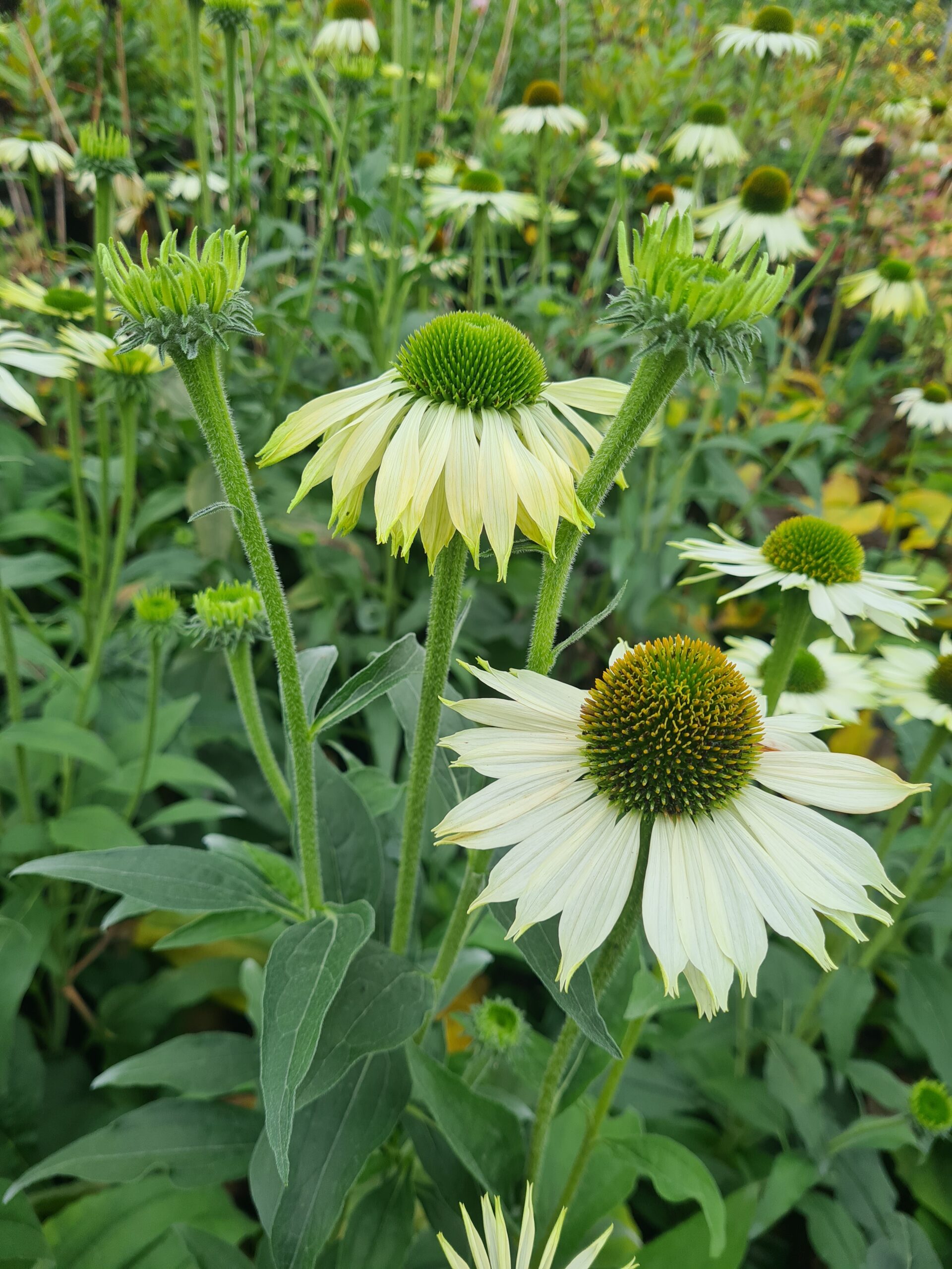 Handsome perennial, Echinacea purpurea 'Alba' is moderately vigorous with large pure white flowers with a prominent raised central greenish-yellow cone. Wit