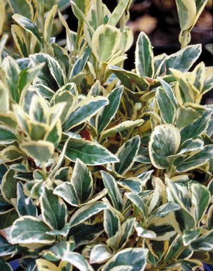Dense, bushy, rounded shrub with evergreen foliage medium green margined with cream white. It's a solid, easy plant, withstanding pollution and coastal loca