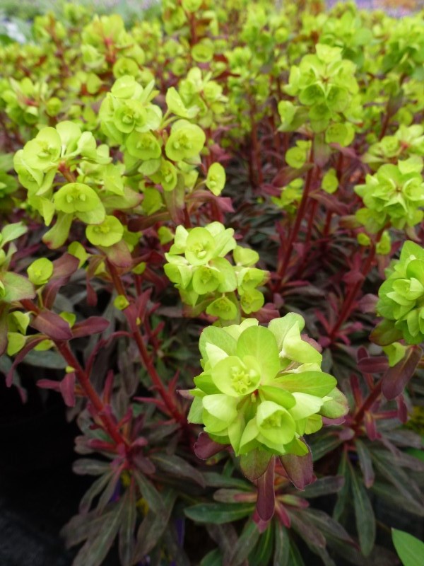 Euphorbia amygdaloides ‘Purpurea’ is a compact, shade-loving euphorbia, bearing acid-yellow blooms in contrast with purple, strappy foliage. It’s a good cho