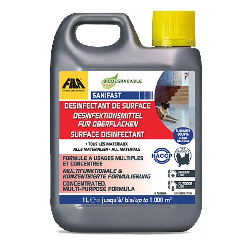 Fila – Sanifast Concentrated Disinfectant eliminates 99.9% of germs and bacteria from surfaces. Can also be used for the maintenance of wax-treated floors.
