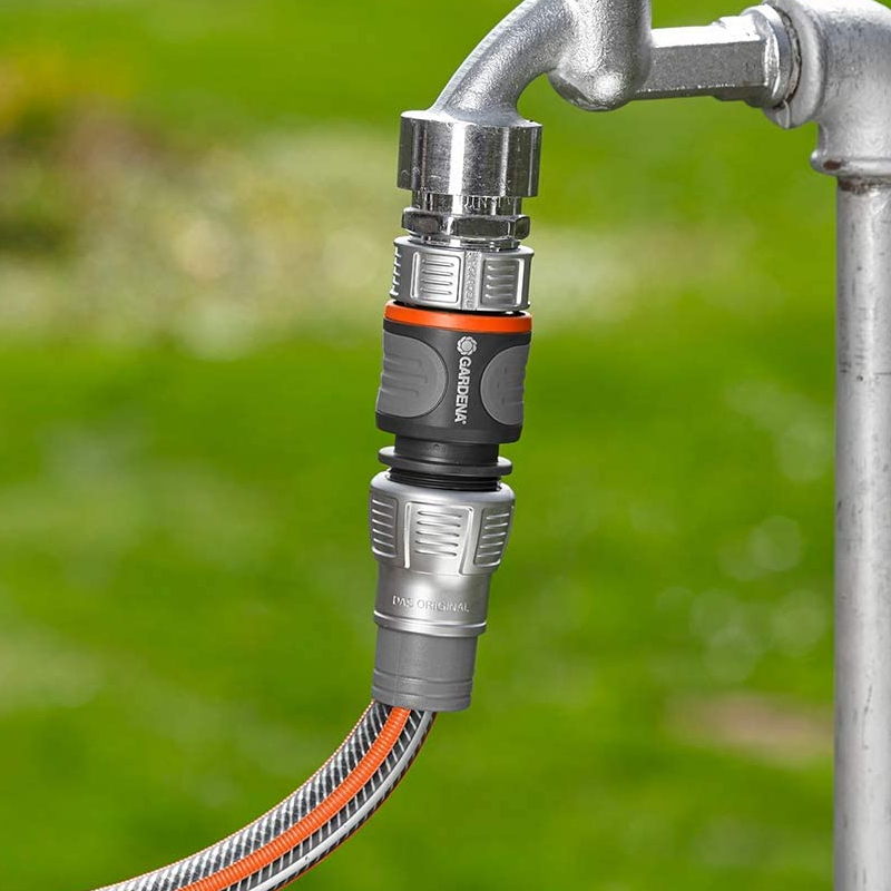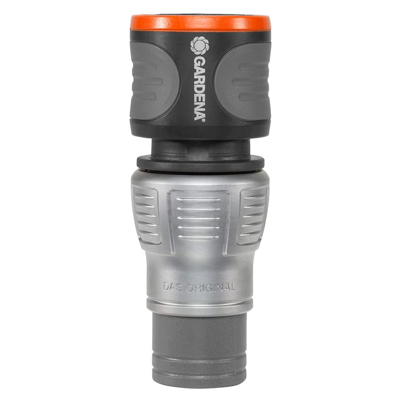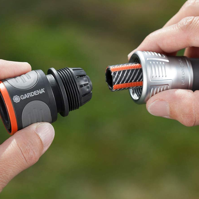 The Gardena Premium Hose Connector in a high-quality metal-plastic design allows the hose to be connected quickly and conveniently. Integrated anti-kink protection prevents the hose from slipping out.