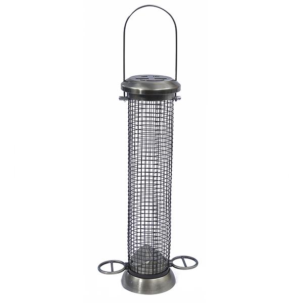 The Heritage Peanut Feeder is a strong & stylish 32cm feeder which holds 500g of the Henry Bell Peanuts. With an easy to open, robust lid and two bird friendly perches the feeder is made in aluminium which is light, strong, corrosion resistant and easy to maintain and beautifully finished in antique gold. The feeder incorporates bronzed crafted square wire mesh to ensure no full peanuts can be taken when feeding.