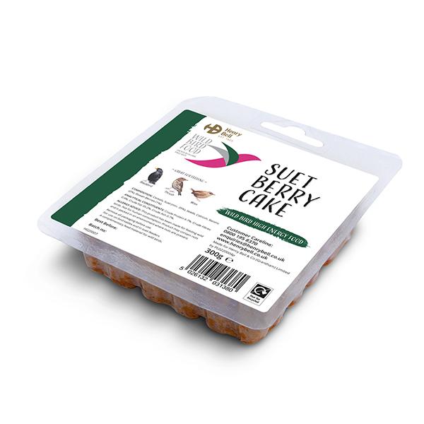 The Henry Bell Berry Suet Cake provides 300g of high energy feed for your wild birds. This can be fed from a suet cake feeder of directly from your bird table. Cereals, Suet (min. 35%), Seeds, Calcium, Raisins (2%), Rowan Berries (1%)