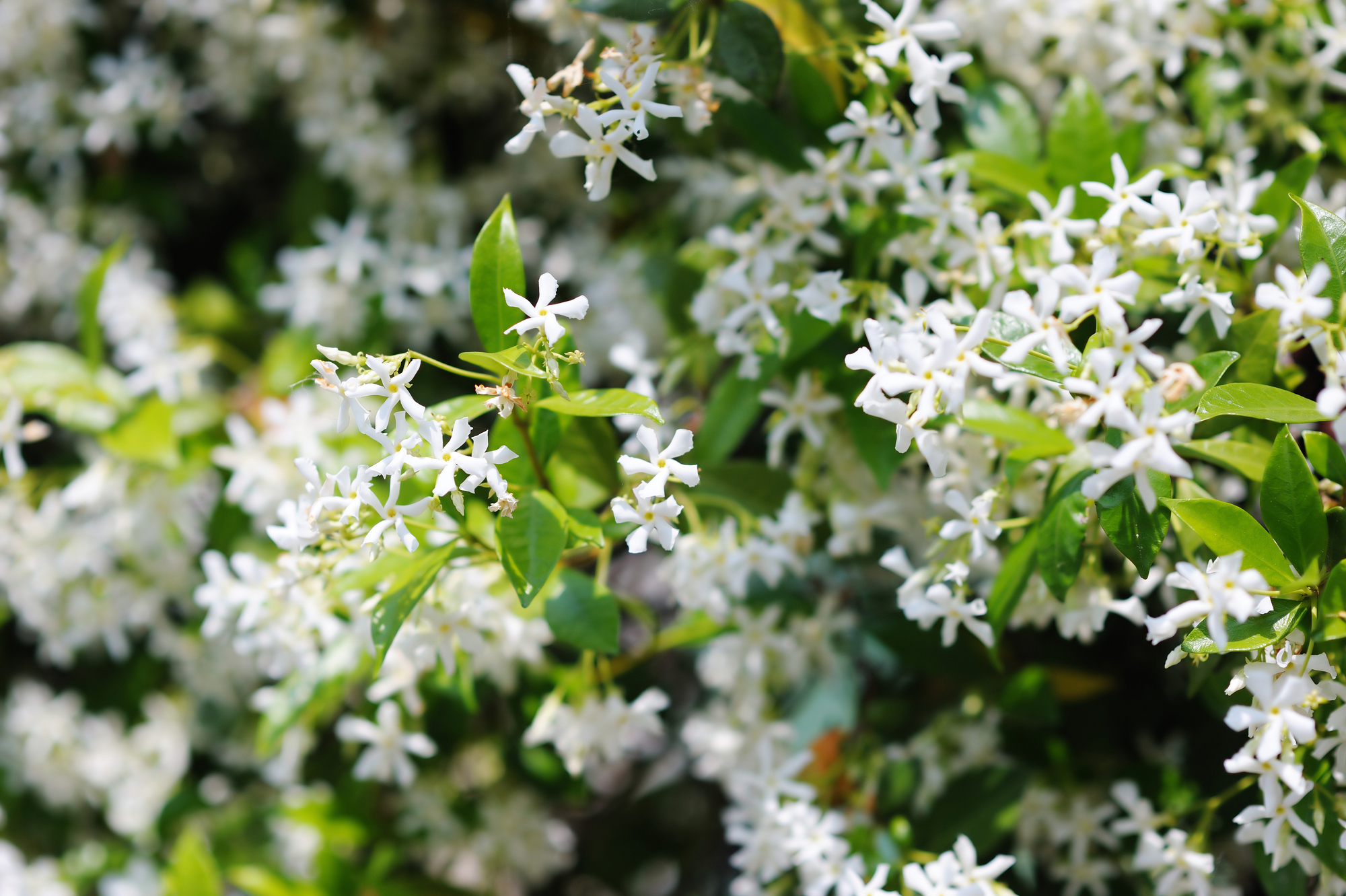 Common jasmine is a sweetly scented, twining climber, flowering from June to late summer/autumn. In a sunny sheltered spot a heady sweet scent lingers from