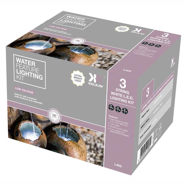 Kelkay Water Feature 3 String White LED Lighting Kit includes two low voltage & safe submersible lights ideal for resin or stone water fountains or features.