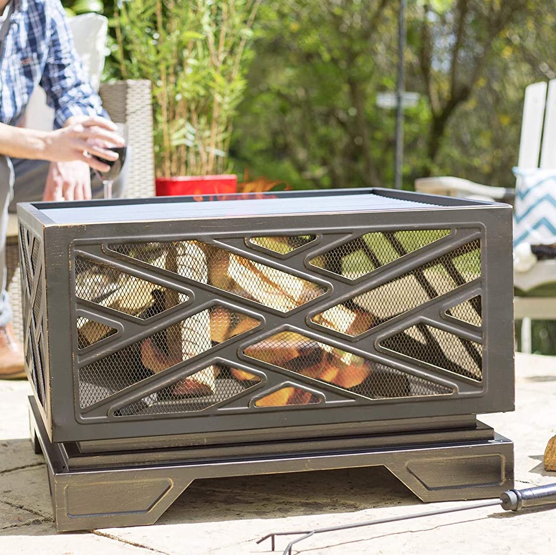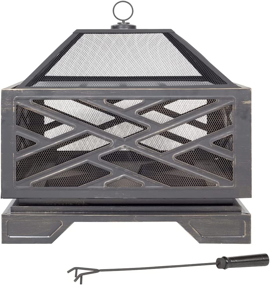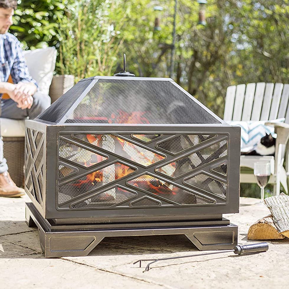 The Brooklyn firepit includes chrome plated cooking grill, mesh lid & safety tool.