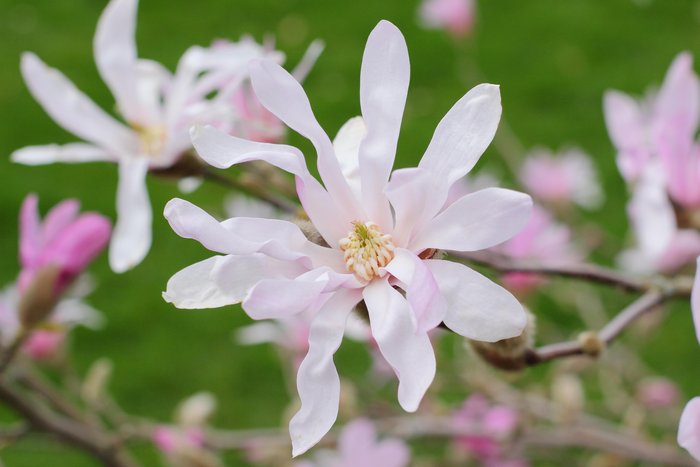 A small magnolia producing an abundance of  blush-white flowers on bare stems in mid-spring. One of the few magnolias to flower freely from a young age. The