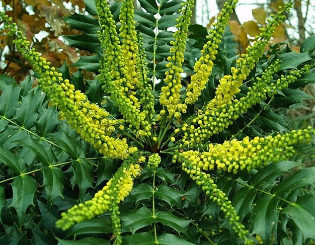 Slender spikes of bright yellow flowers appear from November to March, above rosettes of large, handsome, dark green, holly-like leaves. The flowers of this