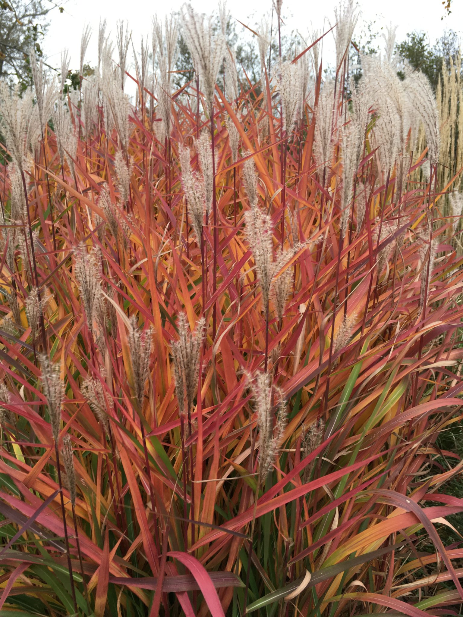 Also known as Flame Grass, this early blooming form of Miscanthus exhibits exceptional red to orange autumn colour. Spectacular, red tipped foliage emerges