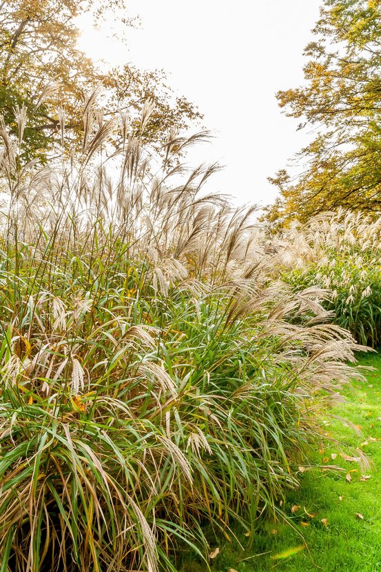 A ctaull, upright feature plant, tall stems swathed from top to bottom in narrow ribbon-like leaves carry upright slender shuttlecocks of feathery plumes si