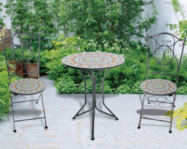 Made from sturdy electro coated steel, this set features an eye-catching mosaic design on both the table and chairs.