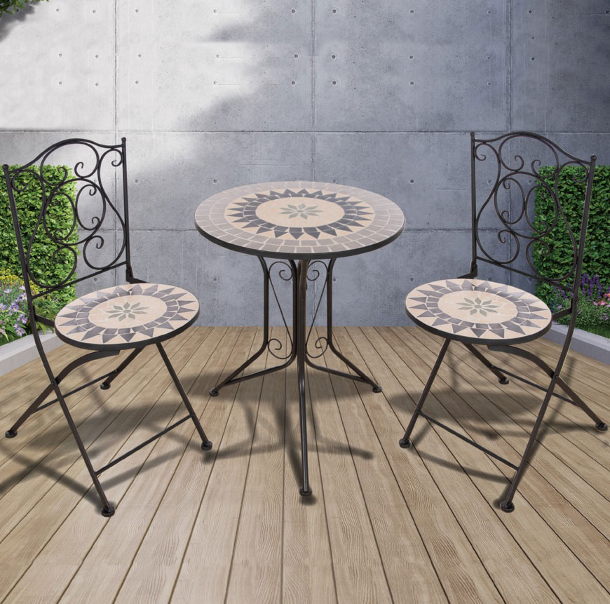 Made from sturdy electro coated steel, with a multi-tonal mosaic tile decoration on both the table and chairs.