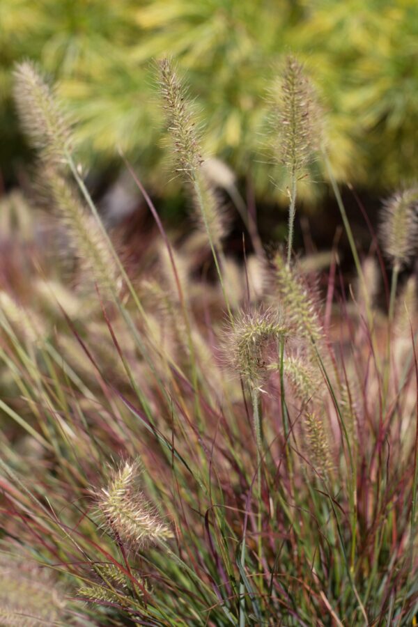 Pennisetum alopecuroides 'Burgundy Bunny' is a compact ornamental grass that brings vibrant colour and texture to gardens. This miniature fountain grass for