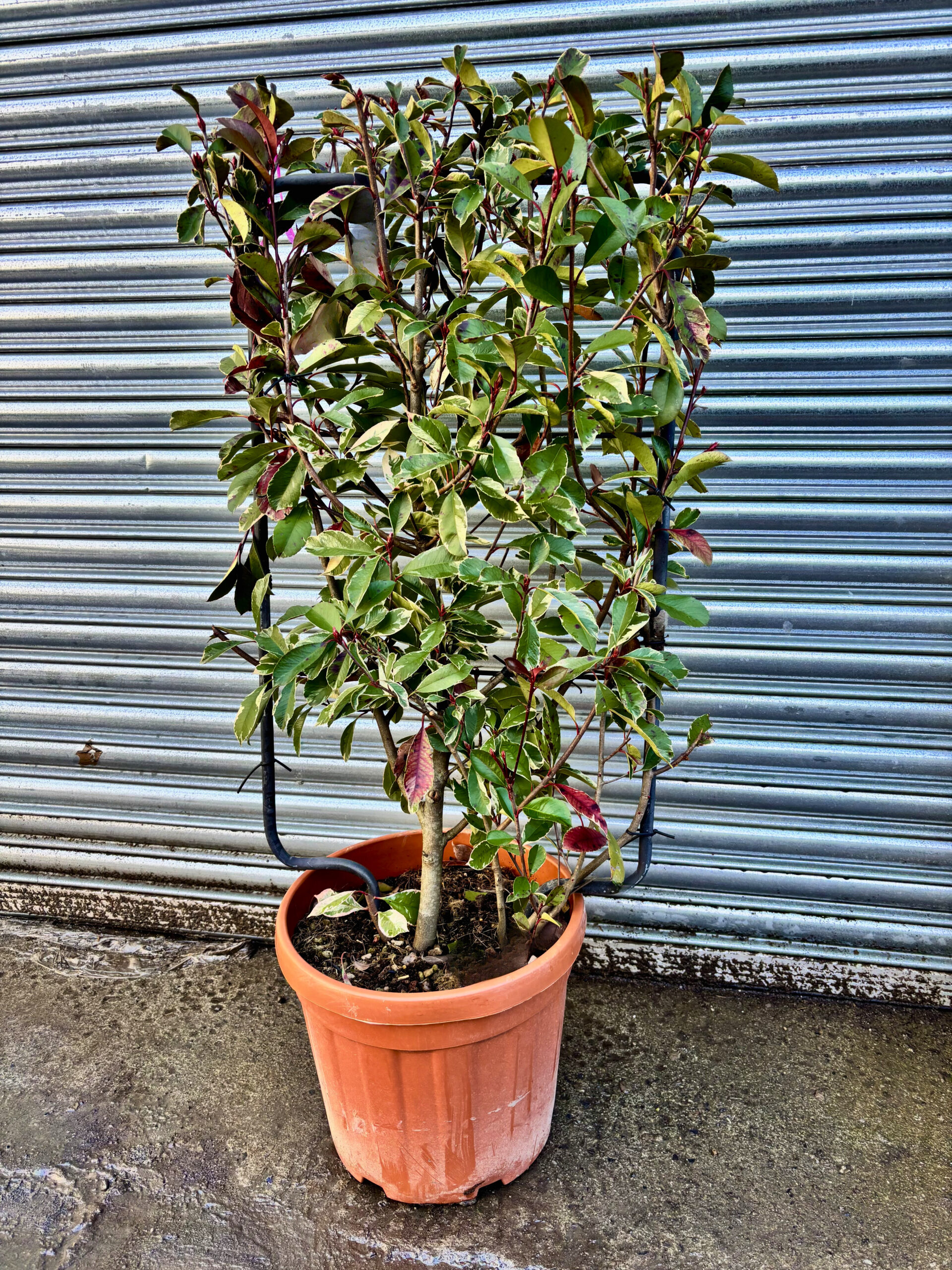 Photinia × fraseri 'Louise' in espalier form is a striking solution for adding colour, structure, and year-round interest to walls, fences, and screens. Trained flat against a support, 'Louise' creates a living panel of narrow, lance-shaped leaves boldly edged in cream and splashed with green, while new shoots emerge in vivid shades of pink and red. The combination of variegation and fresh pink growth ensures a dynamic, multi-tonal display through every season.