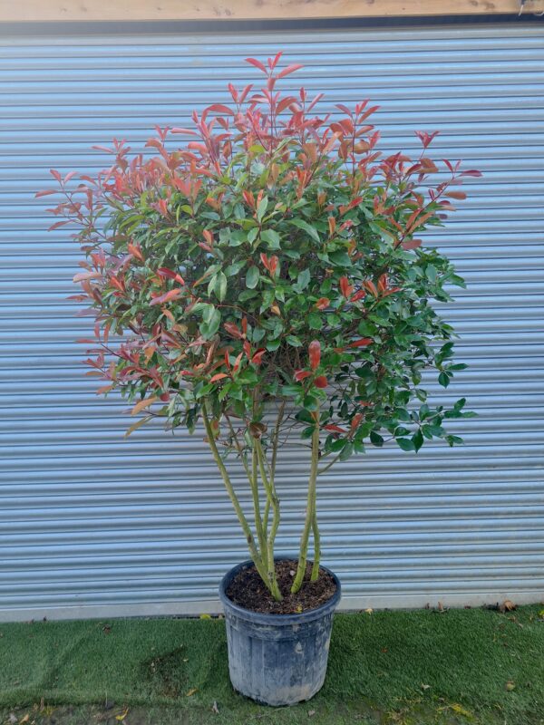 Discover the spectacular drama of Photinia 'Red Robin' trained as a parachute, an architectural masterpiece that brings instant sophistication and year-round colour to British gardens with its stunning red new growth and elegant form. This expertly trained specimen offers the beloved qualities of 'Red Robin'—brilliant scarlet foliage and glossy evergreen presence—elevated on clear stems to create a striking focal point that commands attention whilst maximising ground-level planting space beneath.