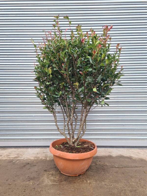 Photinia × fraseri ‘Compacta’ is a dense, evergreen shrub with glossy green leaves and vibrant red new growth. It has a naturally compact habit, making it i