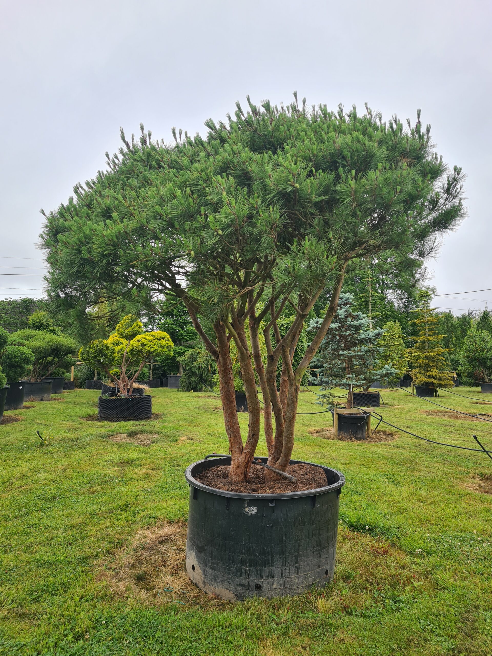 Pinus densiflora 'Umbraculifera' is a slow-growing, multi-stemmed,  vase-shaped selection of Japanese red pine with long, dark-green needles; a heavy show o