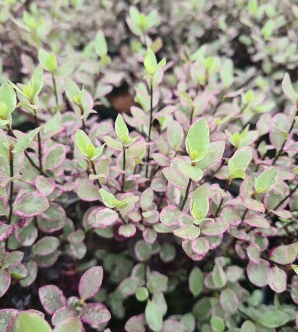 Pittosporum 'Bannow Bay' is a compact evergreen shrub with bright grey-green young foliage with cream edges. In autumn, vibrant pink hues fringe the leaves