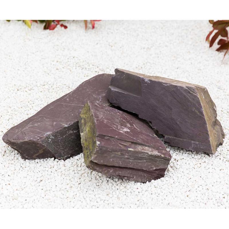 Plum Coloured Rockery Stone. Natural pieces of deep plum slate that looks lovely when wet and will add the extra wow to your pond, water feature or rill, it will contrast and compliment the other aggregates used and planting to produce a very pleasing display. Works well in rock, seaside and Mediterranean gardens to provide contrast to planting and give structure. Can be placed randomly in a border to provide a backdrop to planting and add interest.