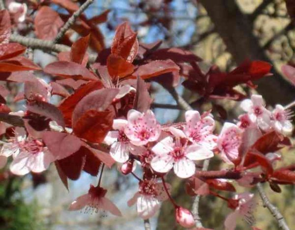 Prunus cerasifera 'Pissardi' is a small, ornamental plum tree with rich, dark-purple leaves displayed on blackish stems, against which the pink buds and blu