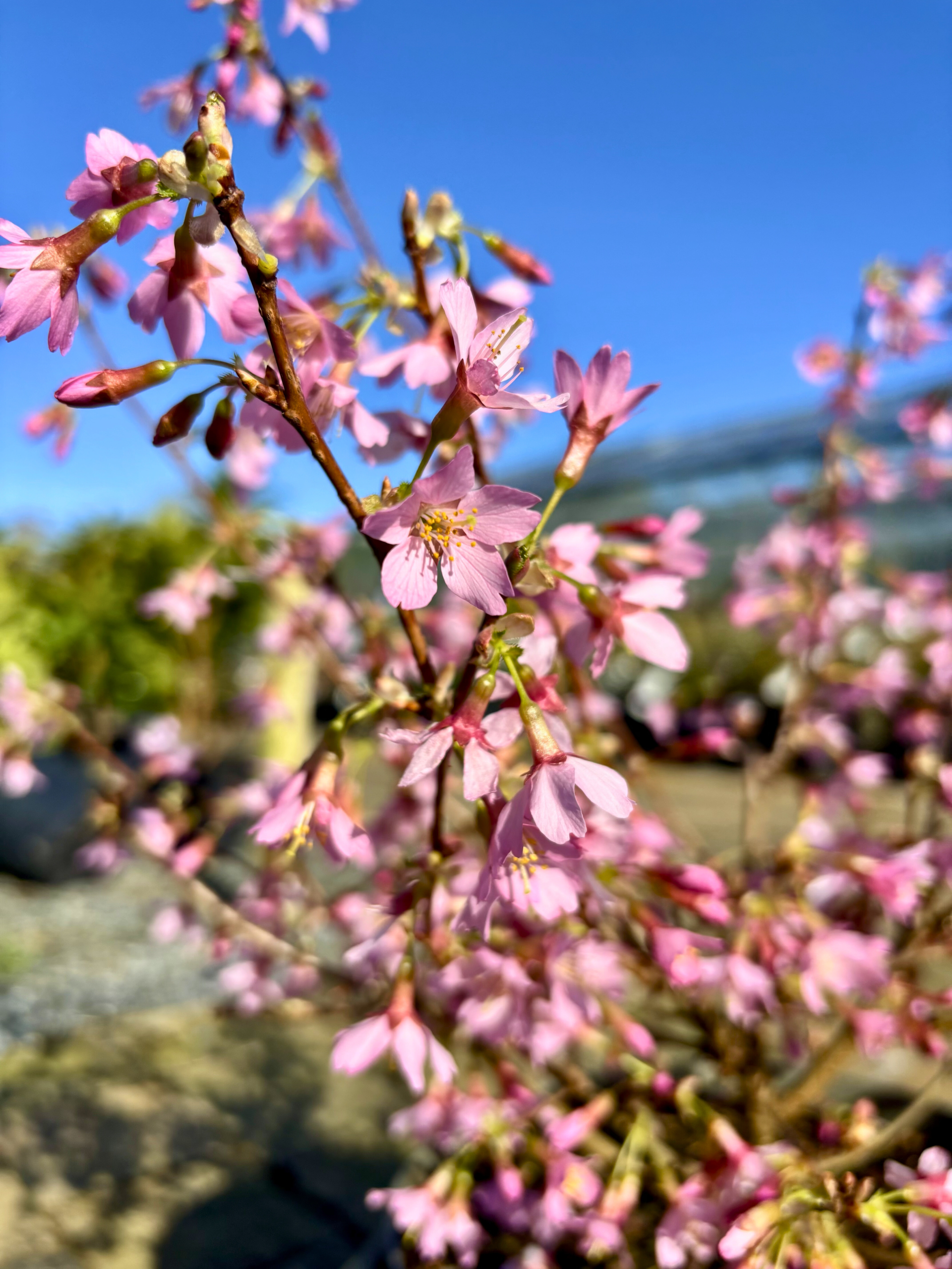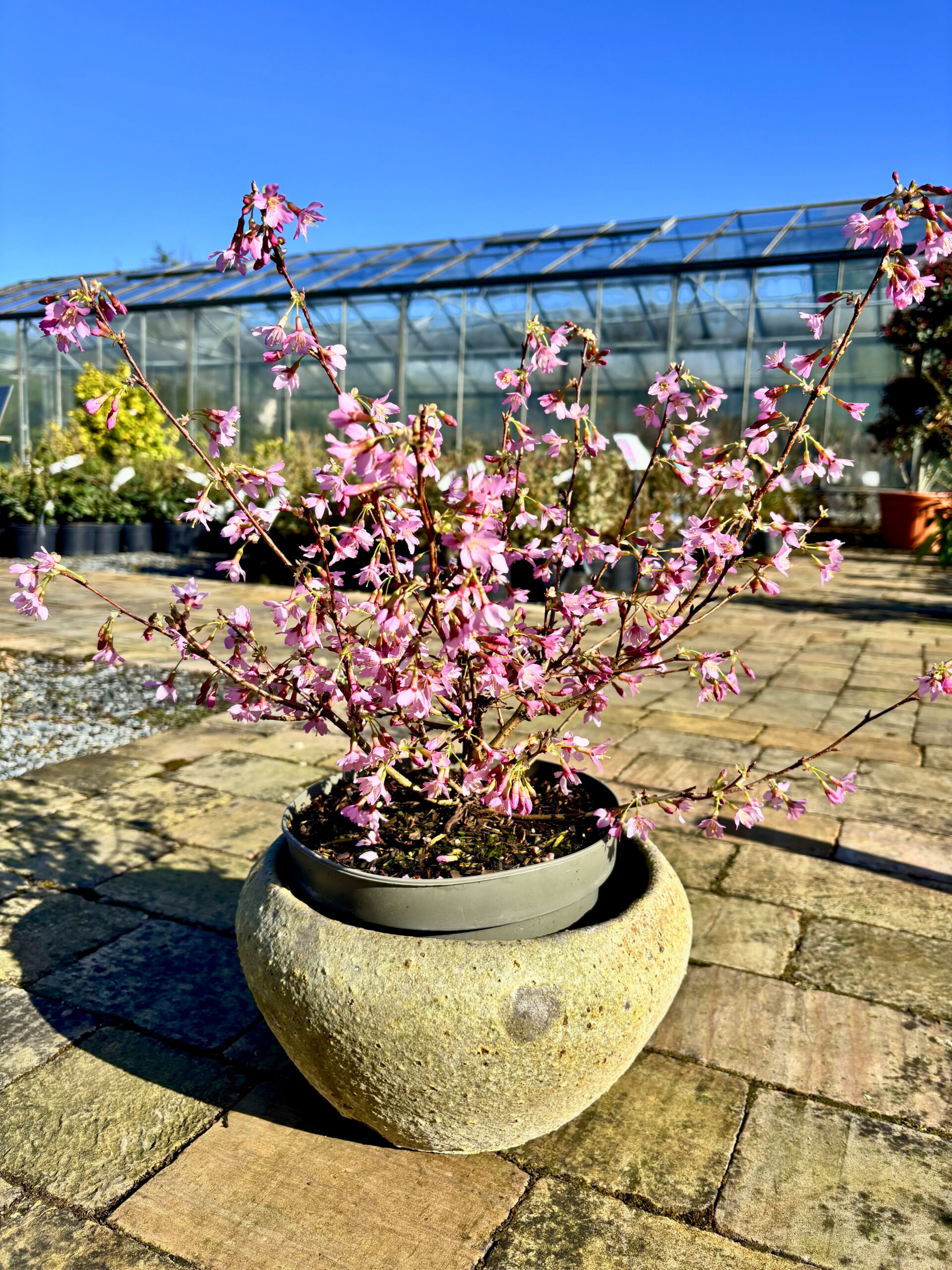 Prunus incisa 'Paean' is a compact, showy Fuji cherry, prized for its profusion of deep rosy-pink flowers that appear along bare branches in early spring. The blooms are single to semi-double, creating a vibrant display just as the garden is waking up from winter. This variety is particularly valued for its intensity of colour—richer and more saturated than many other Fuji cherries.