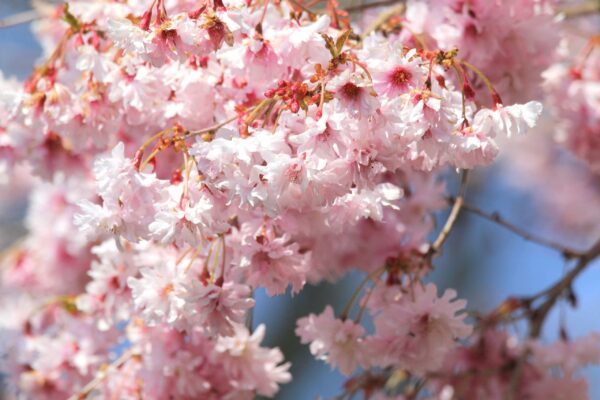 Prunus 'Oshidori' is a beautiful, compact flowering cherry, treasured for its profusion of large, semi-double, deep pink to rose-red blooms in mid-spring. The flowers are especially showy—richly coloured and held in generous clusters along the branches, creating a striking display that stands out even from a distance. The blossom appears just as the new leaves emerge, making the whole tree glow with colour.