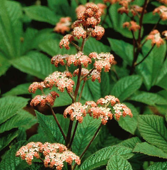With its bold, divided leaves this forms an exotic looking clump that adds a unique foliage accent to any moist border. Large airy plumes of soft pink to ro