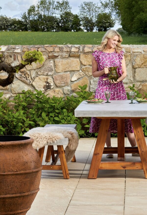 While this Sheepskin throw isn't technically an outdoor one, clearly sheepskin is weather proof in its nature and this one elevates a bench or dining chair