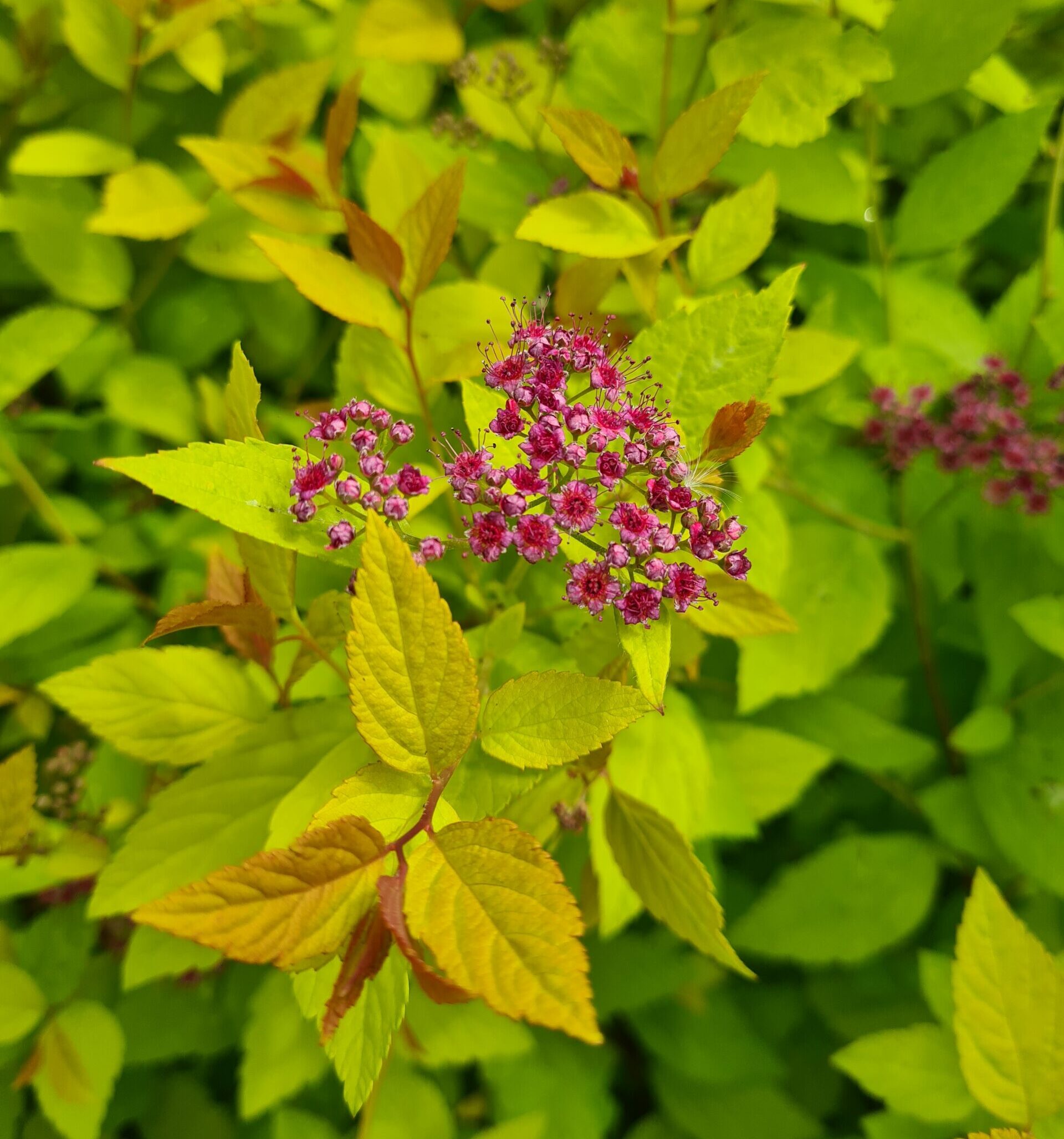 Spiraea 'Firelight' is a very hardy, deciduous shrub with a bushy habit. The new young leaves emerge a bronze-red colour in spring, which mature to yellow-l
