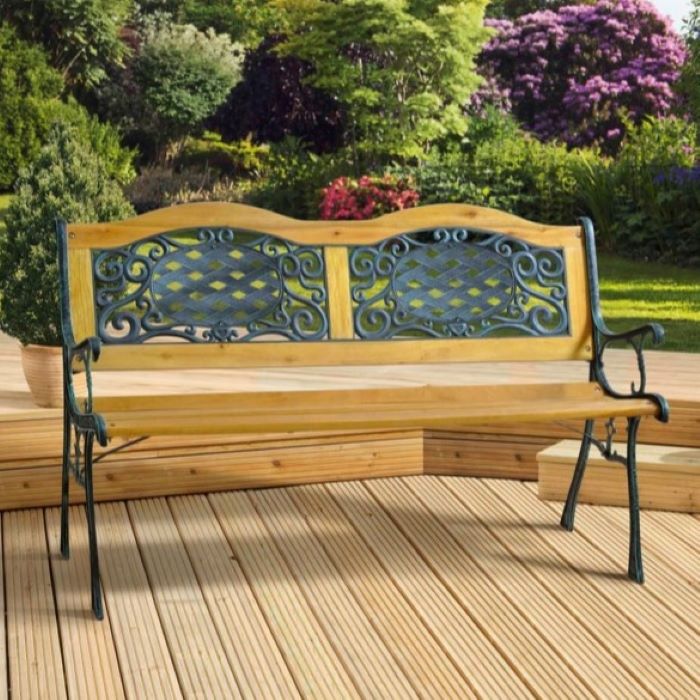SupaGarden – Deluxe Garden Bench with cast iron verdigris finish ends, natural colour hardwood slats and a cross lattice design plastic back.