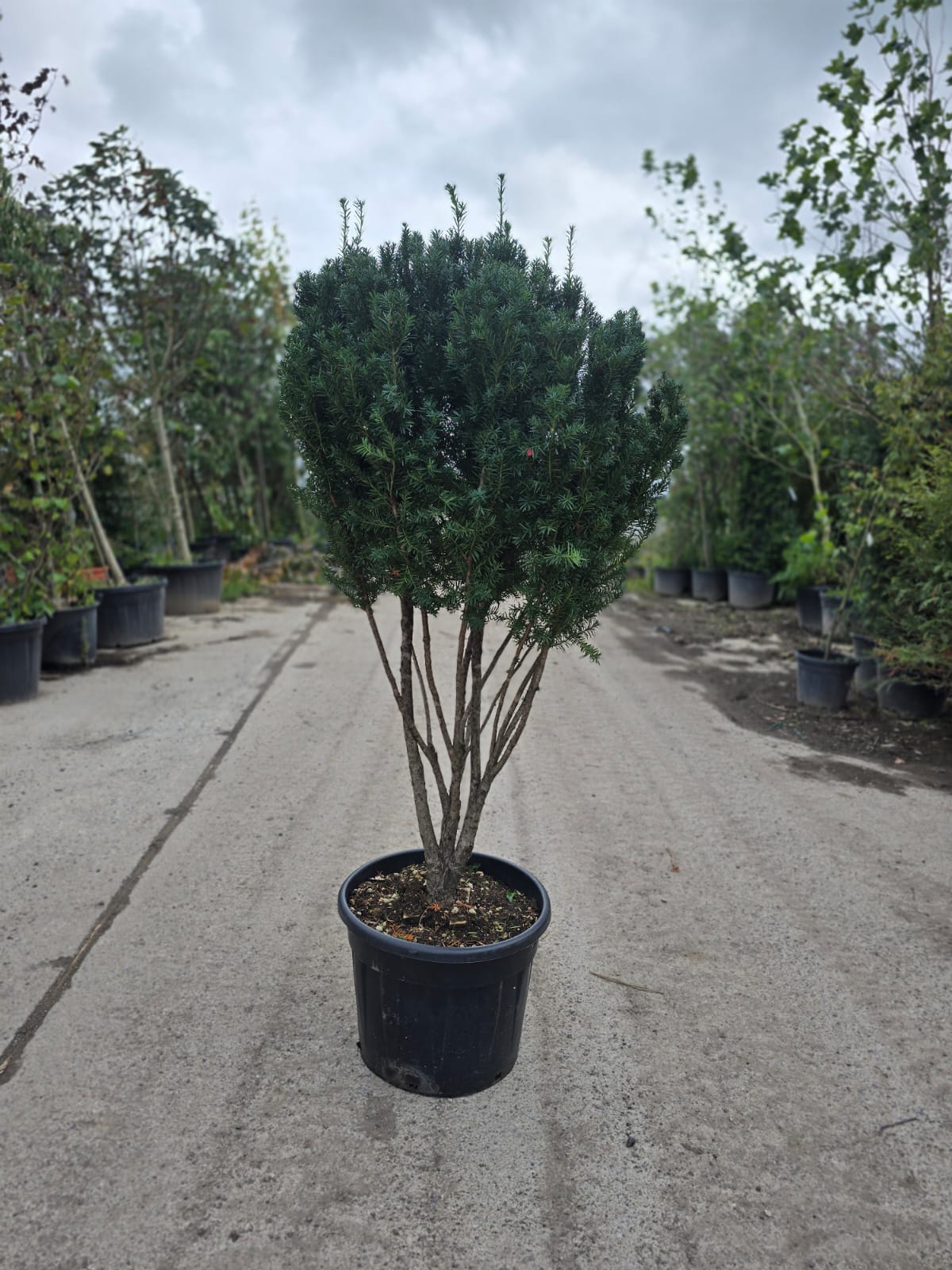 Revered since ancient times for its longevity and resilience, Taxus baccata thrives in Ireland's temperate climate, tolerating both coastal winds and inland frosts with remarkable fortitude. This specimen's multi-stem architecture offers unique design possibilities, serving equally well as a statement piece in formal gardens or as a sophisticated anchor in naturalistic plantings. Its dense growth provides excellent screening whilst maintaining an air of refined elegance.