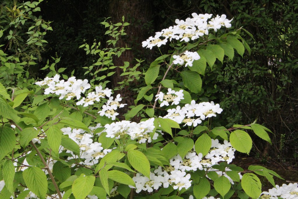 Viburnum plicatum  'Mariesii' provides wide-spreading, tiered branches and prominently veined, dark green leaves that turn purple in autumn. Large lacecap h